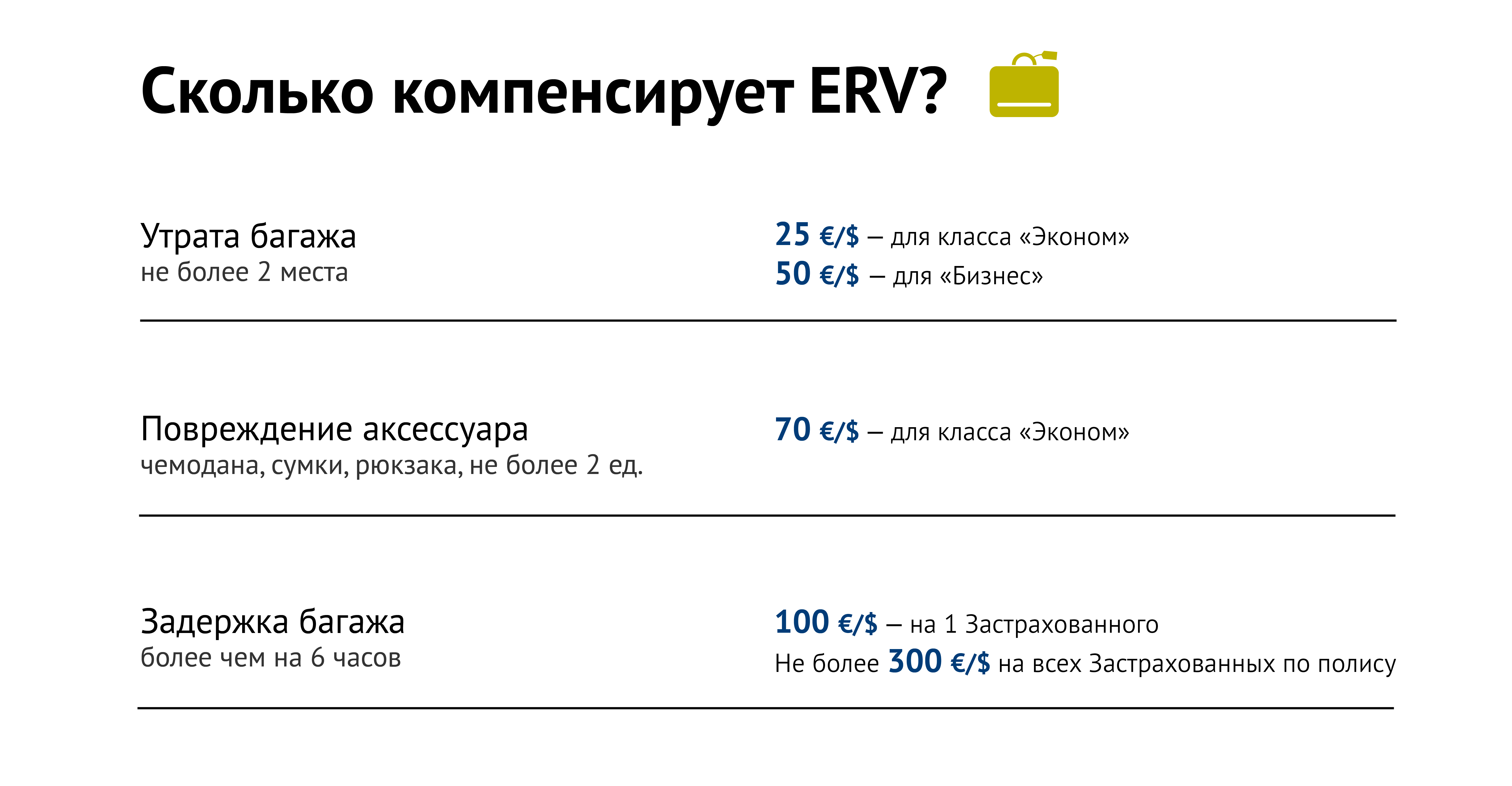По риску страхования багажа в полисах ERV всё просто – мы выплатим фиксированные суммы по факту повреждения, утраты или задержки багажа более чем на 6 часов. Всё что нужно сделать при задержке, утрате или повреждении багажа, – попросить у авиаперевозчика официальный документ, подтверждающий событие, а потом обратиться к нам за получением выплаты.