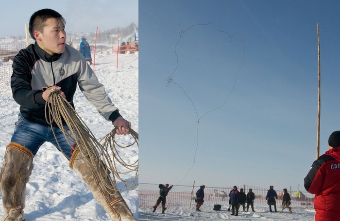 Первым пунктом в программе состязаний заявлено «метание тынзяна на хорей». Суть понятна сразу. Тынзян (лассо для поимки оленей) спортсмен должен набросить на хорей (длинную палку для управления оленьей упряжкой), которую ассистент держит вертикально. Секрет успеха – правильно сложенный тынзян и точный, уверенный бросок.