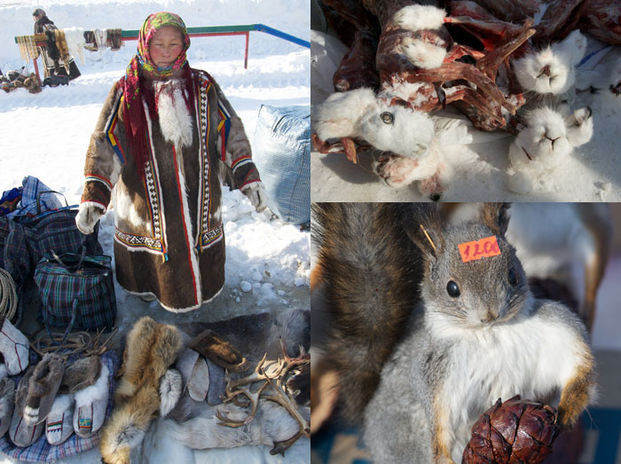 На картонках или оленьих шкурах разложены спецпредложения дня. Вот у местной женщины лежит шкурка лисицы выделанная, с хвостом и головой – 6 тыс. рублей. Заяц полярный, тушкой – 600 рублей. Белка чучелком – по 1200 за штуку. Муксун мороженый – по 500 за кило. Бурки оленьи – 10 тыс. за пару, но уступят и за 8 тыс. Бурки оленьи красивые, до бедра, как у местных, – 20 тыс. Коллеги покупают зайца себе и рога в подарок, а я беру стельки из стриженого оленя – всего по 150 за пару. Кстати, ноги – это первое, что мерзнет, не считая носа. Иду отогреваться в штабной автобус, тем более что замерз не только я, но и камера – от холода залип затвор.