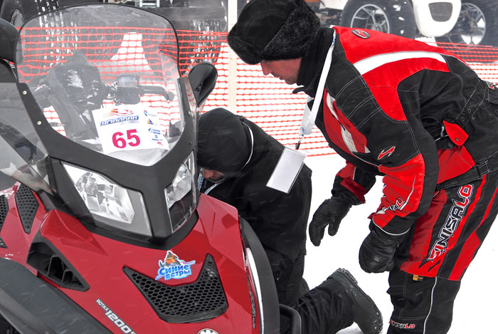 В этот момент на противоположной площадке начинается снегоходный марафон. Так как в прошлом году я уже снимал старт, решаю остаться на борьбе – это мне кажется более интересным. Ну а вам покажу, как выглядит марафон глазами зрителя. Вот суровые смелые парни готовятся к старту и копаются в моторе.