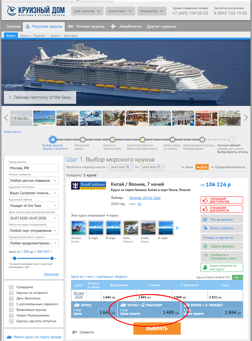 Дисконт по ДКП может достигать от 10 до 40–50 % от круизного тарифа. Для примера возьмем прямо из системы недельный круиз из Китая в Японию в конце июля у Royal Caribbean Int. «Просто круиз» стоит 1642 $, а в динамическом пакете с трансфером аэропорт – порт – аэропорт – 1402 $. Выгода налицо: ваш клиент заплатит за круиз с трансфером туда и обратно на 200 $ меньше, чем за «просто круиз»!